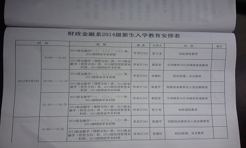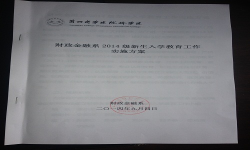 本次入学教育我系高度重视,按照学院要求做了周密部署,制定了《财政金融系2014级新生入学教育工作实施方案》,在教育主题和内容的选择上一方面严格遵照学院要求,另一方面紧密结合新生特点。经过系里酝酿讨论最终选定知校爱校教育、校纪校规及安全教育、文明修养与行为习惯养成教育、心理健康教育、专业认知和学业规划教育、创新创业教育、角色转换及学长导航教育、入党启蒙教育、诚信感恩教育等九个方面作为本次入学教育的主要内容。在入学教育授课方面,我系对所有讲课老师进行了培训,要求他们讲课既要内容翔实又要贴近新生生活,符合新生特点,使他们易于接受,使入学教育真正达到预期目的。在入学教育过程中,所有授课人员基本都达到了备课充分、讲课态度认真、讲究方式方法、课堂生动充实的要求,使枯燥的规章制度在具体事例中变得生动、形象、易于学生理解,使安全知识通过一个个网络图片视频变得丰满,警示效果更加明显,让新生懂得了生命的宝贵,安全的重要。