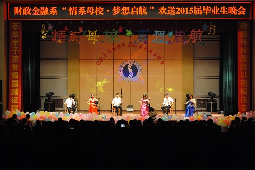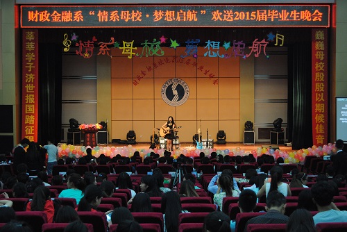 流金六月送别季,歌舞飞扬话离殇。6月17日晚财政金融系在学术报告厅隆重举行“情系母校,梦想启航”欢送2015届毕业生文艺晚会。学院常务董事李晓光、学院执行院长路文江教授、学院党委副书记、副院长马义哈、学院副院长杨培权、院长助理兼教务处处长高军、院长助理兼学生处处长郇东、学院经济学科教学总监樊元教授、学院团委副书记孙世强、艺术设计系党总支副书记周海燕、财政金融系系主任史安玲副教授、系党总支副书记张小龙应邀出席晚会。我院各系部、各部门的老师和我系及兄弟系部的学生共800多人观看了演出。
