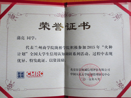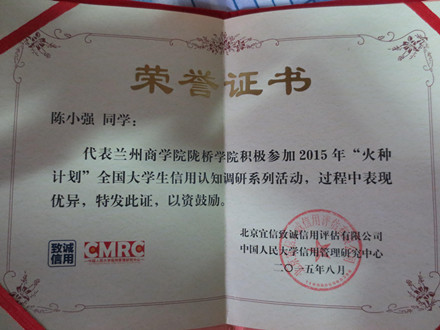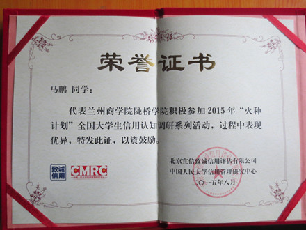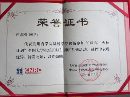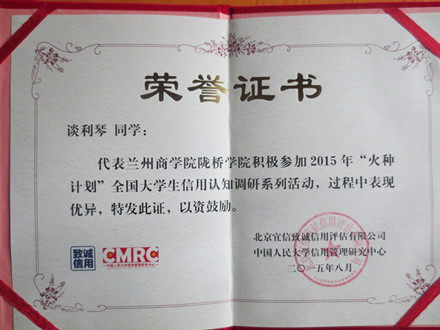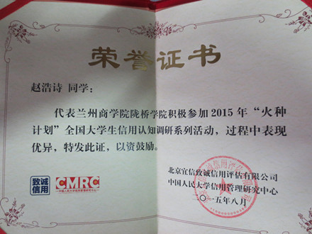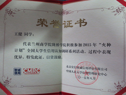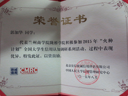 由中国人民大学和宜信致诚公司主办的以“火种计划”为主题的全国大学生信用认知调研项目于2015年5月4日在北京正式启动。本次活动涉及全国22所高校200余名信用管理专业的大学生组成,共有37个调研小队。我院由财政金融系王俊老师指导的马鹏小队和郭加华小队对兰州地区12所院校进行了实地调研,共完成了1500多份有效问卷,并于2015年8月顺利完成2份调研报告。经过专家层层评审,我院2支队伍最终获得优秀奖,王俊老师荣获优秀指导老师的荣誉称号。同时,我院被宜信公司评选为宜信“火种计划-信用教育入校园”合作单位。本次活动不仅有效的提升我院学生的专业实践能力,也为我院信用管理专业的良好发展奠定了坚实基础。
