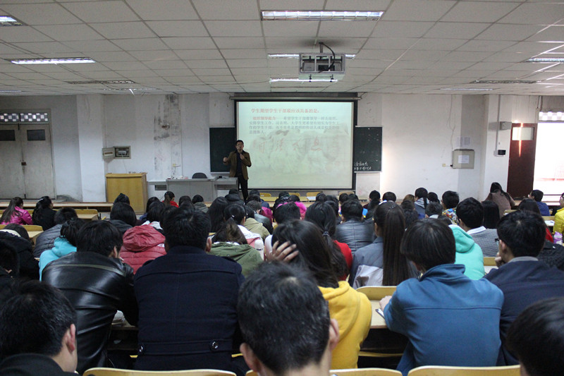 随后,辅导员陈建平老师以《如何做一名合格的学生干部》为主题做了报告,他从大学生干部的现状、当好大学生干部应有的素养、学生干部应处理好的几种关系、学生干部人际交往中的礼仪等六个方面为同学们做了阐述。