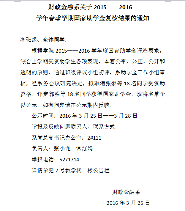 财政金融系关于2015——2016学年春季学期国家助学金复核结果的通知
