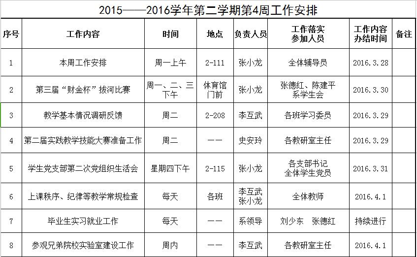 2015——2016学年第二学期第4周工作安排