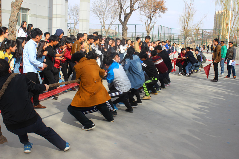 本次活动以班级为单位,共组成14队,每支队伍由7名男生和5名女生组成,比赛实行3局2胜淘汰制。比赛中,各参赛队同学表现出了顽强的意志和拼搏精神,既赛出了水平又赛出了风格;在啦啦队同学震耳的“加油”呐喊声中,各班同学鼓足了劲,涨红了脸,抓紧了绳,全力以赴,努力争夺。一旁的啦啦队比参赛者还起劲,扯开喉咙拼命喊,张开手臂用力挥,加油声、叹息声、欢笑声此起彼伏,充分体现了同学们团结友爱、顽强拼搏、不服输不言败的精神风貌,这正是:赛场上,热汗淋淋;赛场下,加油助威!一场场比赛也牵动着老师们的心,辅导员老师纷纷在旁加油助威,呐喊声中,师与生融为一体,师生的心贴得更紧了。