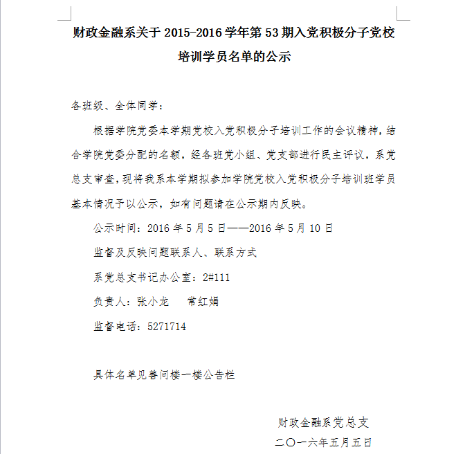 财政金融系关于2015-2016学年第53期入党积极分子党校培训学员名单的公示