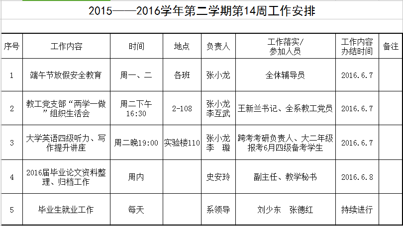 2015——2016学年第二学期第14周工作安排