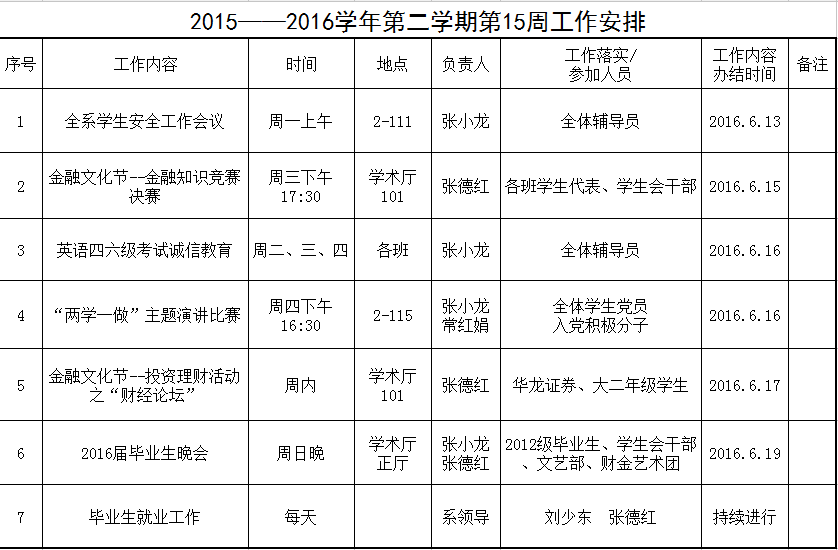 2015——2016学年第二学期第15周工作安排