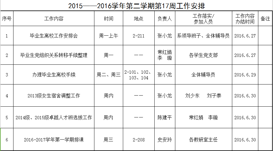 2015——2016学年第二学期第17周工作安排