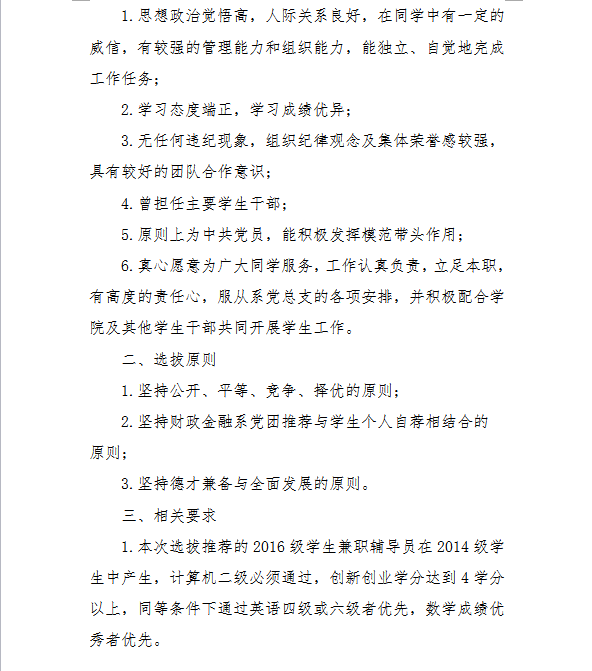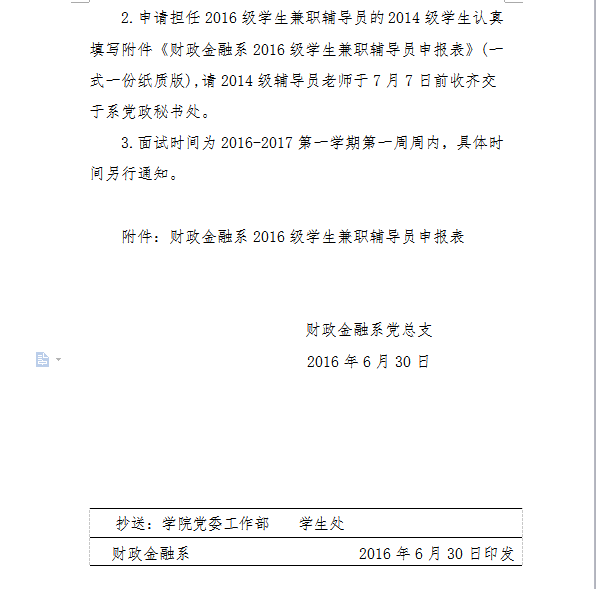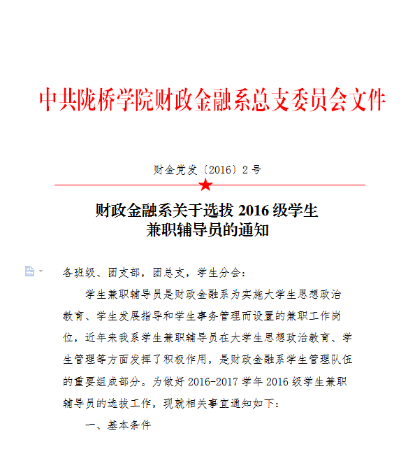 财政金融系关于选拔2016级学生兼职辅导员的通知