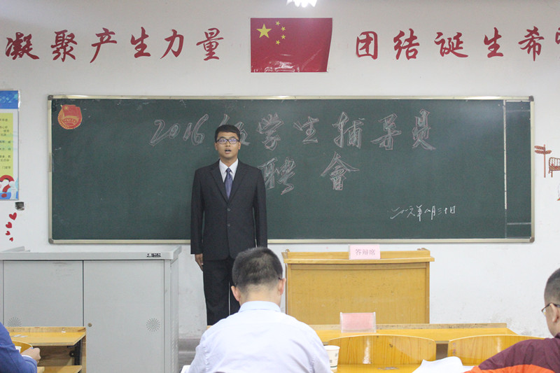 面试采取答辩形式,主要根据班级文化的建设、宿舍安全与卫生的管理、学生突发事件的处理等实际性问题对参加面试学生进行了提问,以考察每位面试学生的观察、承受压力、协调组织等能力。面试结束后,在场老师认真分析面试中每位同学的表现,通过民主投票的方式最终选出了7位优秀学生协助带班辅导员老师参与2016-2017学年2016级新生班学生管理工作。