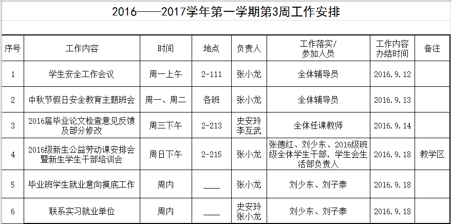 2016——2017学年第一学期第3周工作安排