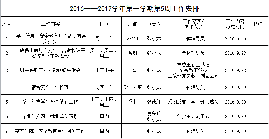 2016——2017学年第一学期第5周工作安排