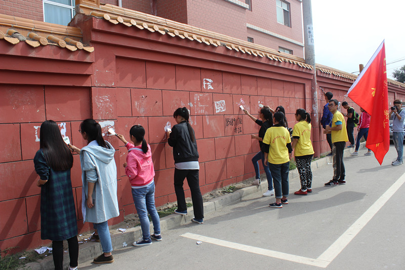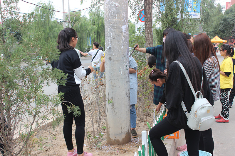 活动内容主要是清洁校门口围墙上的小广告,绿化带里的垃圾,同学们不怕辛苦、认真负责,经过一个半小时的劳动顺利完成了任务。