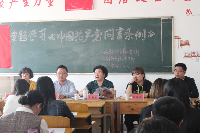 学院党委书记王新兰教授指出,《问责条例》是继《中国共产党廉洁自律准则》、《中国共产党纪律处分条例》修订后,全面从严治党的又一重要组成部分。作为高校教师,要深刻认识到学习《问责条例》的重要性,深入领会条例精神,先学一步、学深一步,切实提高监督问责能力。在实际工作中,要强化问责措施,结合具体事例,贯彻落实条例内容。她也对参会的全体党员老师提出希望:一定要加强政治学习,做有涵养、有风度的高校教师。对于学校来说,学习是组织的体现形式;对于师资来说,学习是第一要义;对于老师来说,学习是完善自我的唯一通道,要把学习当做一种生活状态。