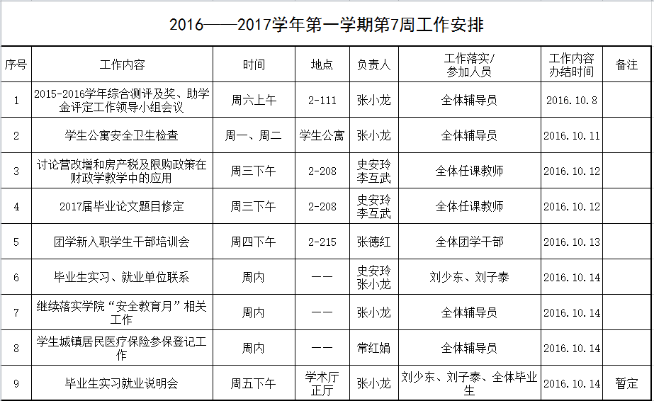 2016——2017学年第一学期第7周工作安排