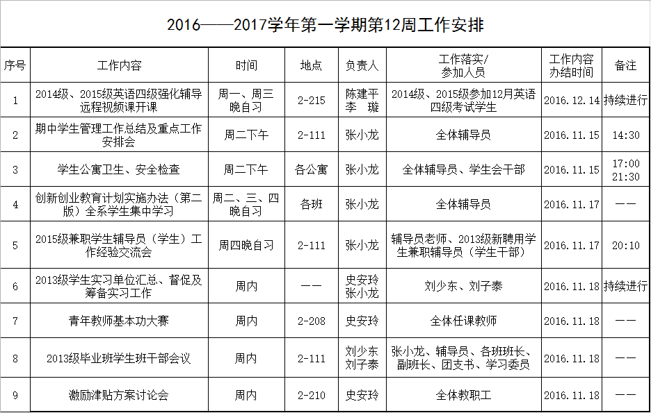 2016——2017学年第一学期第12周工作安排