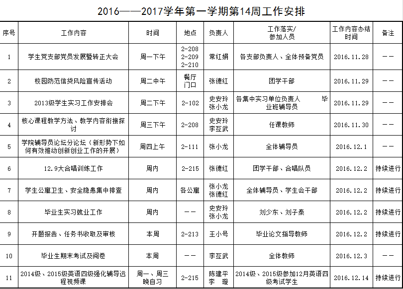 2016——2017学年第一学期第14周工作安排