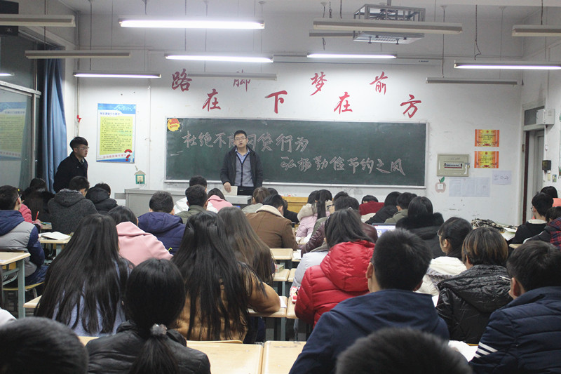为进一步加强校园网贷监管和整治,做好网贷风险提示和宣传教育工作,防止学生陷入网络信贷的骗局,切实保障广大学生的人身及财产安全,12月18日晚自习,财政金融系各班级召开了以“杜绝不良网贷行为,弘扬勤俭节约之风”为主题的班会。院党委副书记兼学生处处长郇东检查并指导了班会进程。