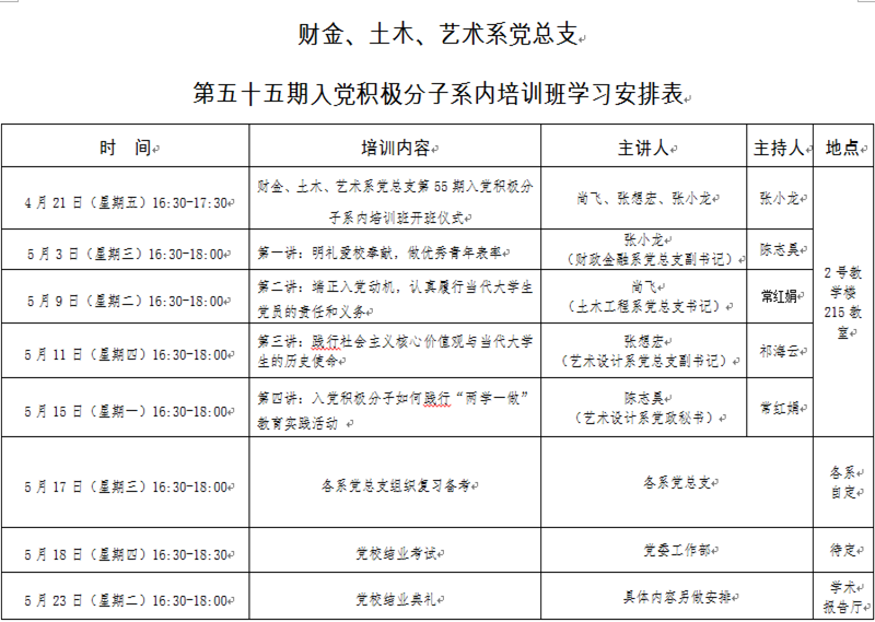 本次开班仪式的举行意味着第五十五期入党积极分子系内培训的开始,系内联合培训是强化系内培训的有力抓手,希望全体入党积极分子通过学院党校的集中培训和系内联合培训,全面掌握党的最新理论成果,将自己的思想和行动统一到党组织上来,更好地发挥入党积极分子的先锋模范作用,不断提升自我、完善自我,通过自己的不懈努力,早日加入中国共产党。