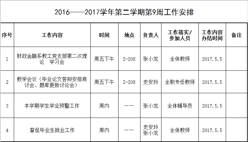 2016——2017学年第二学期第9周工作安排