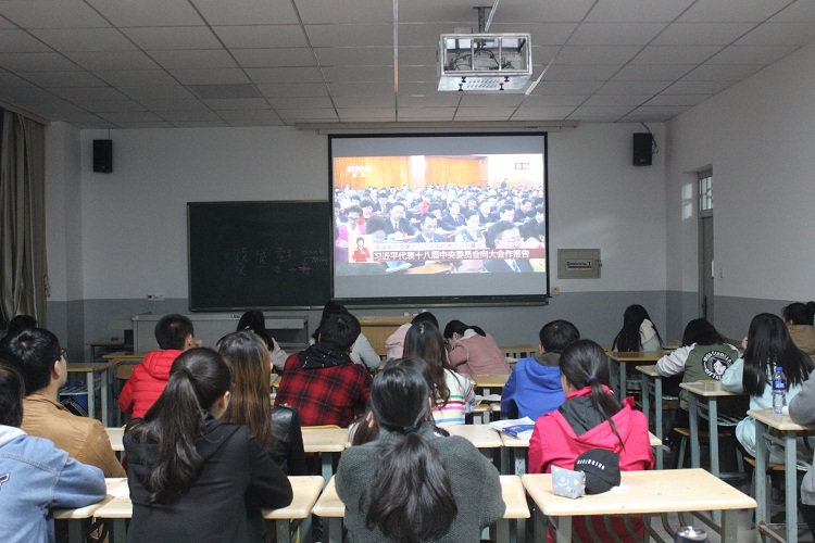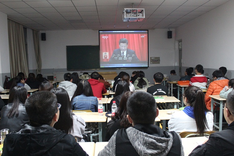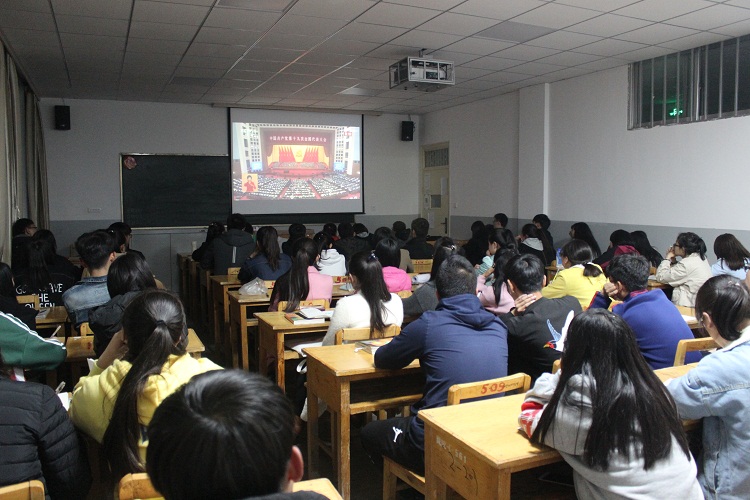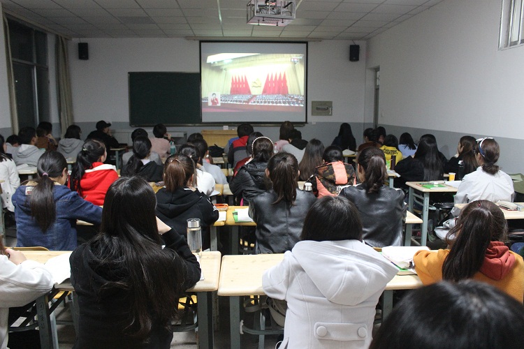 随着国歌声响起,全体起立,奏唱国歌,师生的眼光都聚集到了大屏幕上,大家认真收看习总书记在开幕式上作的题为《决胜全面建成小康社会 夺取新时代中国特色社会主义伟大胜利》的报告。中国共产党第十九次全国代表大会庄严肃穆的会场和习总书记铿锵有力的发言使在场师生肃然起敬,大家都被这庄严的气氛所感染,目不转睛地观看了整个过程。