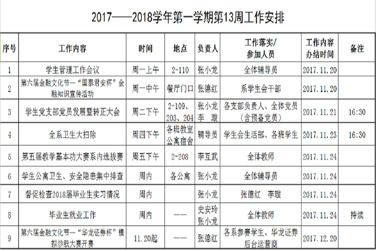 2017——2018学年第一学期第13周工作安排