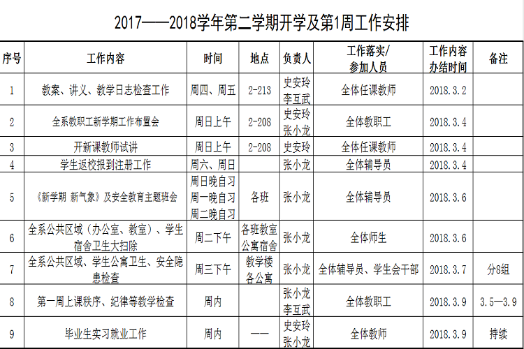 2017——2018学年第二学期开学及第1周工作安排