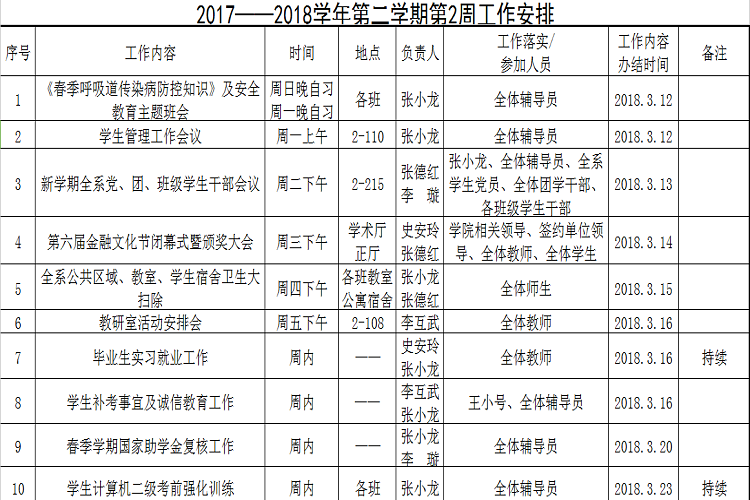 2017——2018学年第二学期第2周工作安排