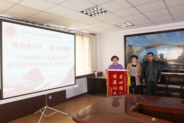 2018年3月29日下午,学院在行政楼二楼会议室举行了爱心善款的交接仪式,学院党委书记王新兰,党委副书记郇东,董事会办公室副主任付乐宁,财政金融系领导班子、全体辅导员,孙国荣同学的父母亲参加了善款交接仪式。交接仪式由党委副书记郇东主持。学院党委书记王新兰代表全体师生将捐助善款交到了孙国荣的父母亲手中。学院领导一再鼓励孙国荣的父母亲要坚强,要有战胜疾病的信心和力量,安心给孩子治病,争取让孩子早日康复。孙国荣的父亲非常激动,他说到:孩子己经毕业快两年了,真的没有想到,学校领导、老师还对他如此关心,非常感激,并对所有关心和捐助的师生表示衷心的感谢。
