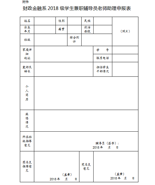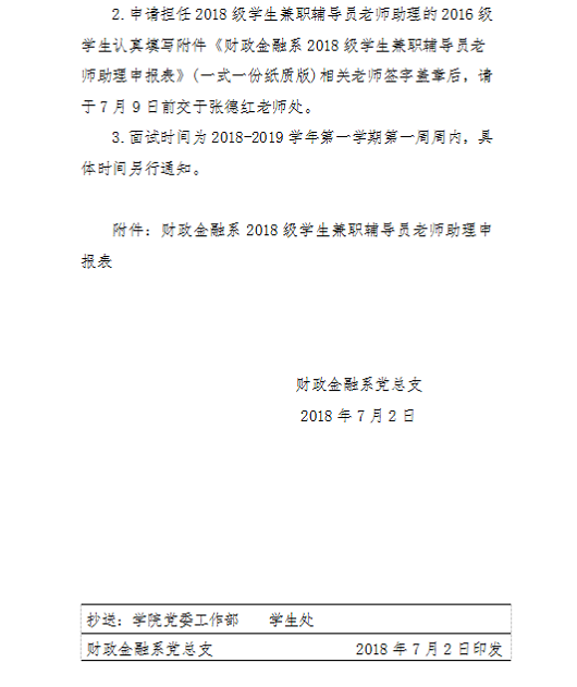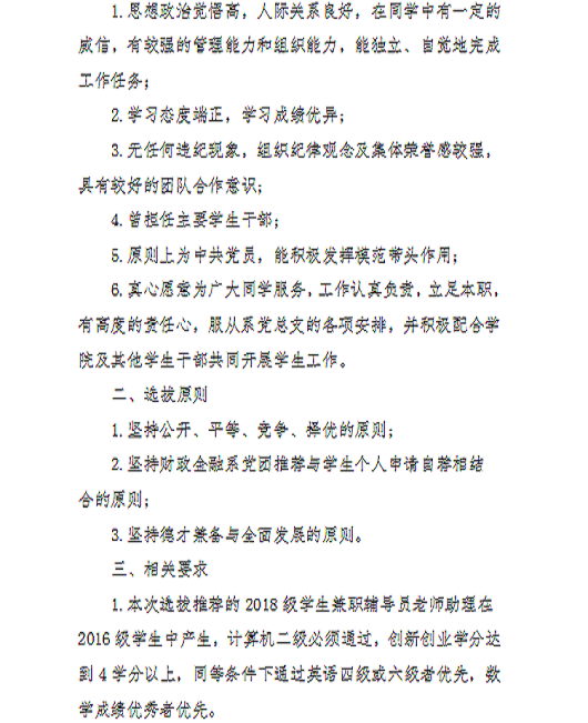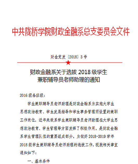 财政金融系关于选拔2018级学生兼职辅导员老师助理的通知