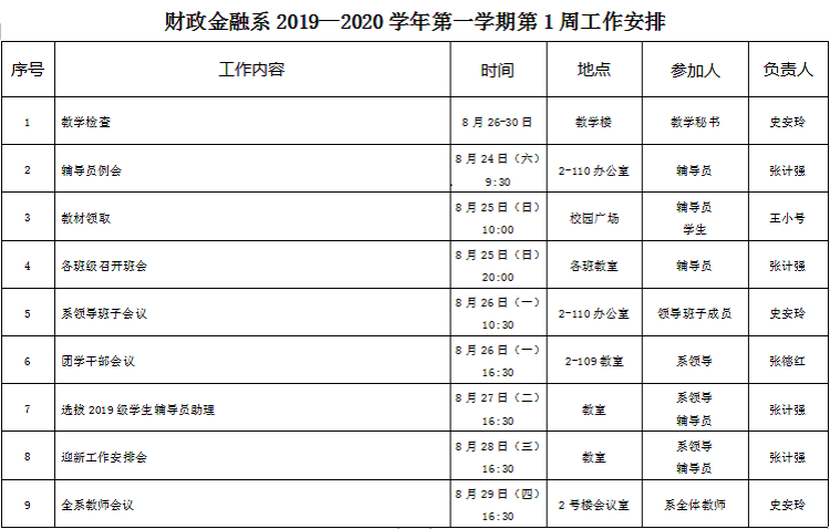 财政金融系2019—2020学年第一学期第1周工作安排