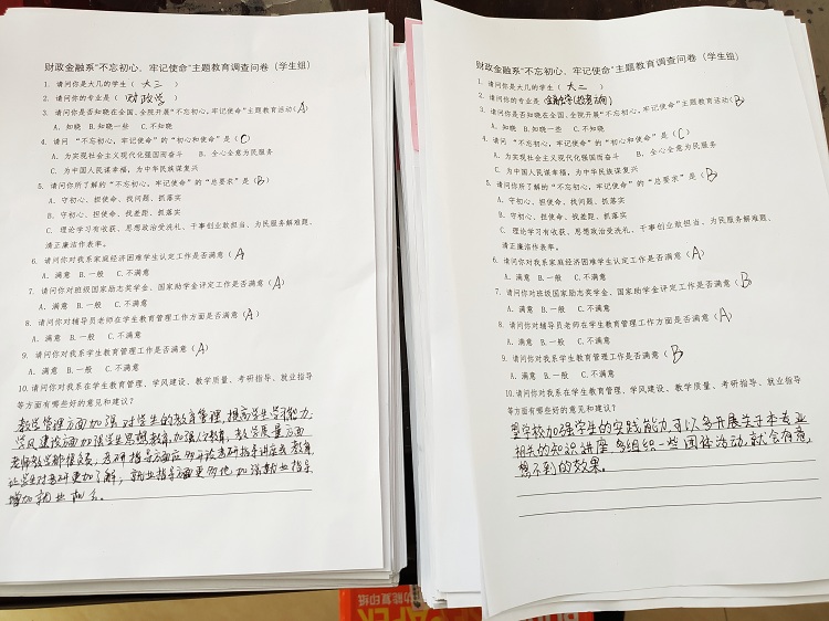 根据学院党委《关于开展“不忘初心,牢记使命”主题教育的实施方案》的有关要求和财政金融系《关于开展“不忘初心,牢记使命”主题教育的学习计划》的有关安排,10月21-28日,系领导班子深入师生中间,通过召开师生座谈会、发放调查问卷、个别访谈等方式,了解广大师生在学习、工作和生活情况,认真听取广大师生的意见建议。