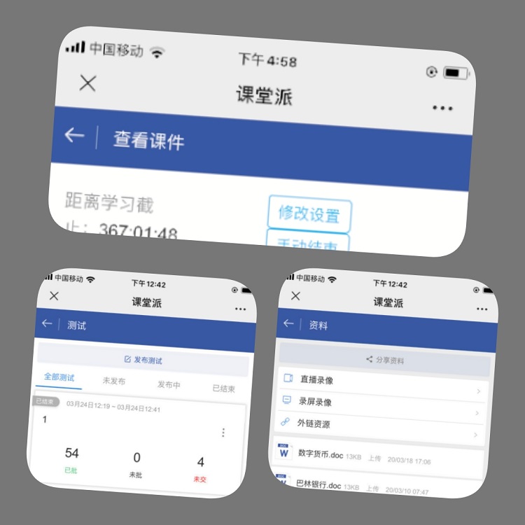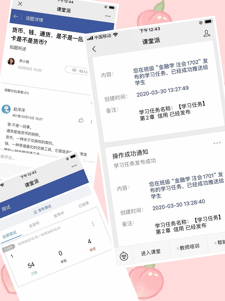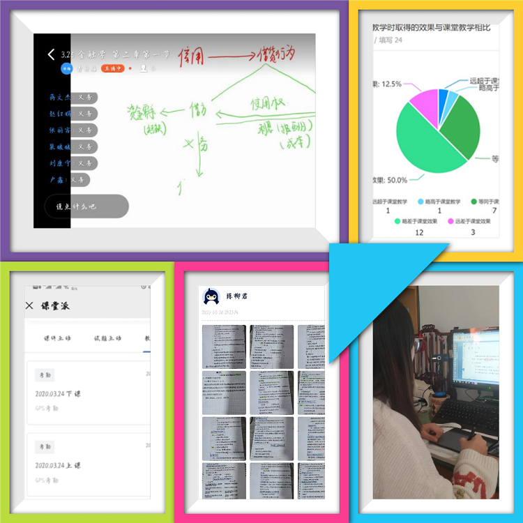 为了强化课堂管理,老师们相互交流,互相学习,积极采取各种小程序强化课堂管理。目前大多数老师都使用课堂派进行课堂管理,实现了考勤、作业、提问等多项课堂功能于一体,也有老师采用QQ老师助手和雨课堂等平台进行课堂管理,弥补了线上教学课堂管理的不足。