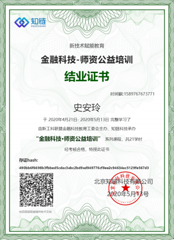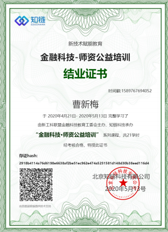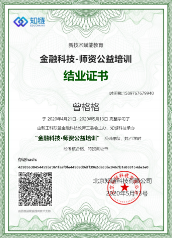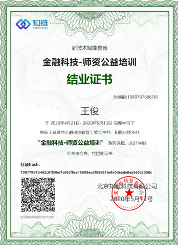 新型冠状病毒疫情仍在持续,虽然开学延缓,但是疫情挡不住老师们成长的脚步。财政金融系的教师们除了日常的备课、教学研讨和教学观摩之外,还积极参加校外的线上培训。2020年4月21日至5月13日,我系教师史安玲主任、王俊副教授、曾格格、曹新梅、韩宇滢等教师完整学习了由新工科联盟金融科技教育工委会主办、知链科技承办“金融科技·师资公益培训”系列课程,共21学时。
