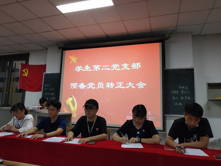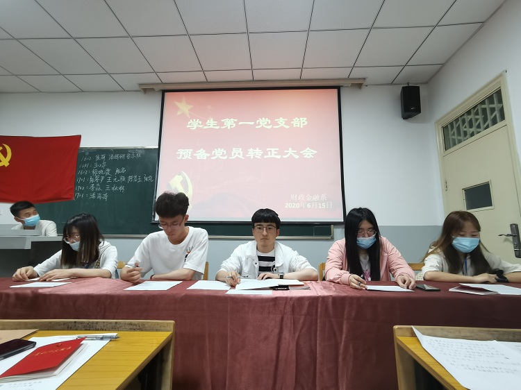 2020年6月16日,财政金融系召开学生一、二党支部大会,讨论了关于杨晓霞等26名同志的转正问题,大会由各支部书记主持。