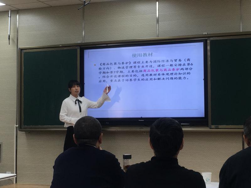 王育琴老师讲授的主要是商品包装部分,具体内容是商品防震和防潮包装技术。讲授由说课和讲课两个环节构成,说课主要涉及教材选定、教学重难点、教学目标和教学方法等,讲课部分展示出了她针对具体学生群体和课程性质做出的教学设计,使用引导案例引入本节重难点内容,引发学生思考,讲解突出重点理论知识,根据课程内容加入案例分析,理论联系实际。讲课完成后,针对本次课进行了反思,及时发现问题和不足之处,有利于教师教学水平的不断提高。