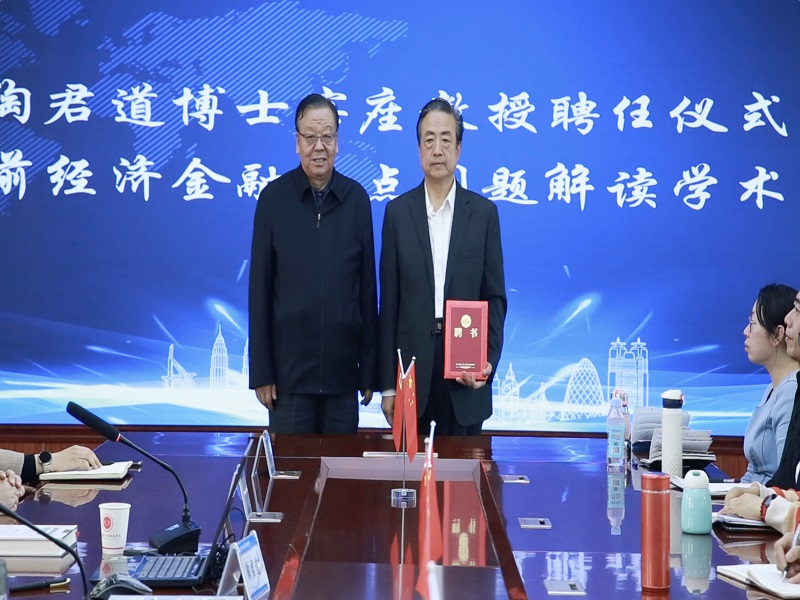 活动中,校长完颜弟研究员为陶君道博士颁发客座教授聘书,陶博士为学校领导及与会师生赠送著作。并做了题为《当前经济金融热点问题解读》的报告。