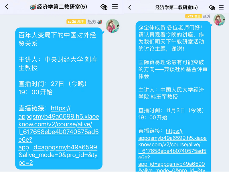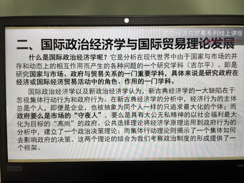 疫情期间,在保障线上教学质量,做好线上教学的同时,在教研室主任牵头,全教研室老师积极参与下,经济学第二教研室分别于10月27日和11月3日晚线上观看了由中国人民大学出版社特别联合中国管理现代研究会国际商务谈判专业委员会组织,以“国际经济与贸易”为主题的系列讲座。