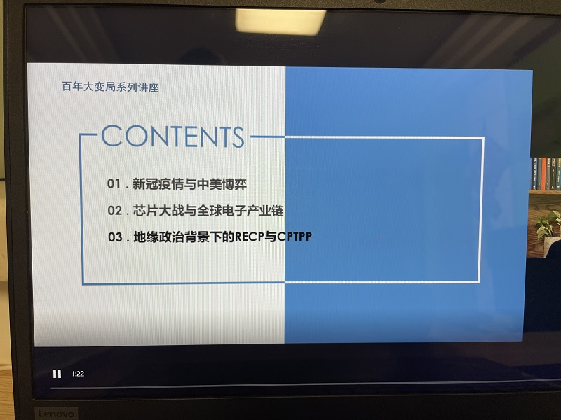 10月27日晚的讲座内容以“百年大变局下的中国对外经贸关系”为主题,由中央财经大学国际经济与贸易学院刘春生副教授主讲。讲座内容包括三部分:新冠疫情与中美全面竞争;芯片大战与全球电子产业链;地缘政治把背景下的RCEP与CPTPP。