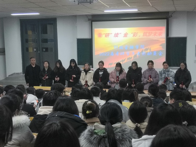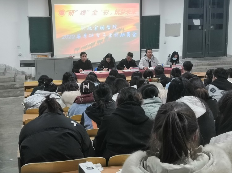 为鼓舞2022届考研学子士气,再创考研佳绩,12月7日下午,财政金融学院在善问楼115教室召开“研”续“金”彩,筑梦未来--考研学子考前动员会。院长梁磊,党总支书记张计强、毕业生辅导员及2022届考研学生参加了大会。