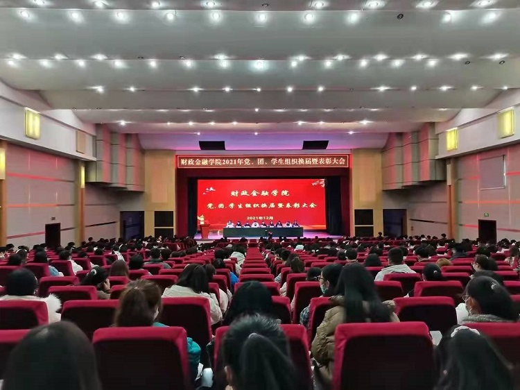 为加强基层党组织、团学组织建设,充分发挥党员学生干部在新形势下思想政治教育中的作用,2021年12月17日,财政金融学院在学术报告厅召开2021年党、团、学生组织换届暨表彰大会。院长梁磊、教学总监赵明霄、党总支书记张计强、副院长李互武以及全体辅导员和党、团学生干部、学生代表共计 600余人参加本次大会,大会由团总支书记张德红主持。