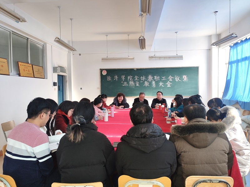 12月23日下午,经济学院在明辨楼413教室召开全体教职工会议暨“三热爱”教育大会。经济学院院长胡瑜杰、教学总监樊元教授、党总支书记秦勇、院长助理王红娟及全体教职工参加了会议。会议由院长胡瑜杰主持。