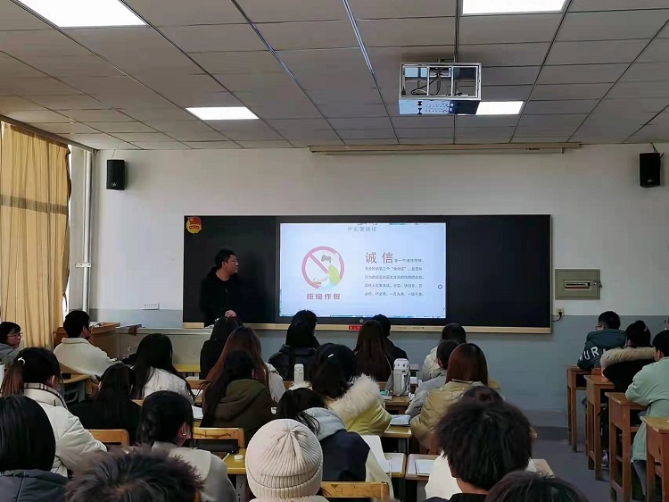 第二场班会课上,刘少东老师针对期末考试,以“诚实做人、诚信考试”为主题,以诚信的由来讲起,以历年考试违纪被处分学生的案例为素材,告诫学生“在生活中要诚实、在做事上要守信、在考试中要诚信”。班会上,还组织学生集体学习了《兰州工商学院学生考试违纪及作弊处理办法》,签订了诚信考试承诺书。