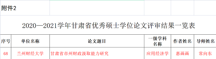 据甘肃省学位委员会甘肃省教育厅发布的《关于公布2020—2021学年甘肃省优秀博士硕士学位论文名单的通知》,全省共107篇硕士学位论文被评为省级优秀硕士学位论文,我院教师惠画画撰写的硕士学位论文《甘肃省市州财政汲取能力》位列其中,这也是2020—2021学年甘肃省唯一入选应用经济学学科方向的优秀博士硕士学位论文。