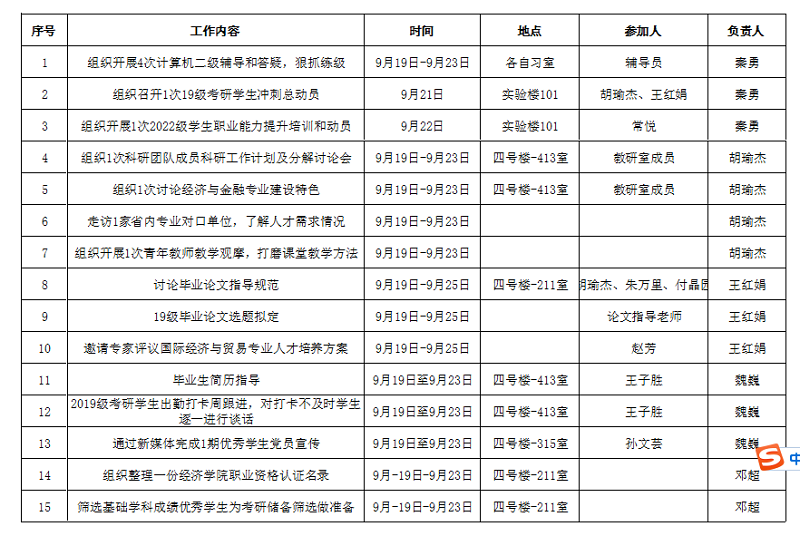 经济学院2022-2023学年第一学期9月19日至9月25日工作安排