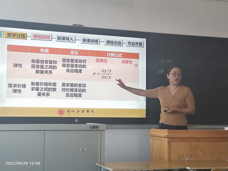 本次活动,由经济统计学教研室陶鹤老师和应用经济学教研室吴金红老师进行示范教学,全体教师进行观摩和交流。陶鹤老师以统计学中最小二乘法公式推导为例,分享如何调动学生参与课堂的教学方法,陶鹤老师说:由于学生数学基础不同,授课过程中对教学重点、难点的讲授要有耐心,推导讲解要细致,利用提问、计算例题、板书推导等教学方法,举一反三,加深学生对知识的理解和掌握;应用经济学教研室吴金红老师以西方经济学中弹性理论应用的讲授为例,分享如何进行理论联系实际的教学方法,通过案例分析及讨论,激发学生主动思考问题、提高主动回答问题的积极性,提升学生课堂教学的参与性。
