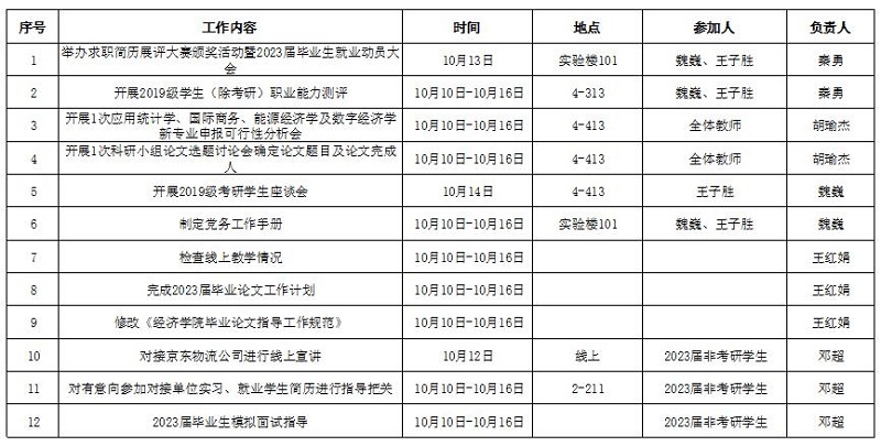 经济学院2022-2023学年第一学期10月10日至10月16日工作安排