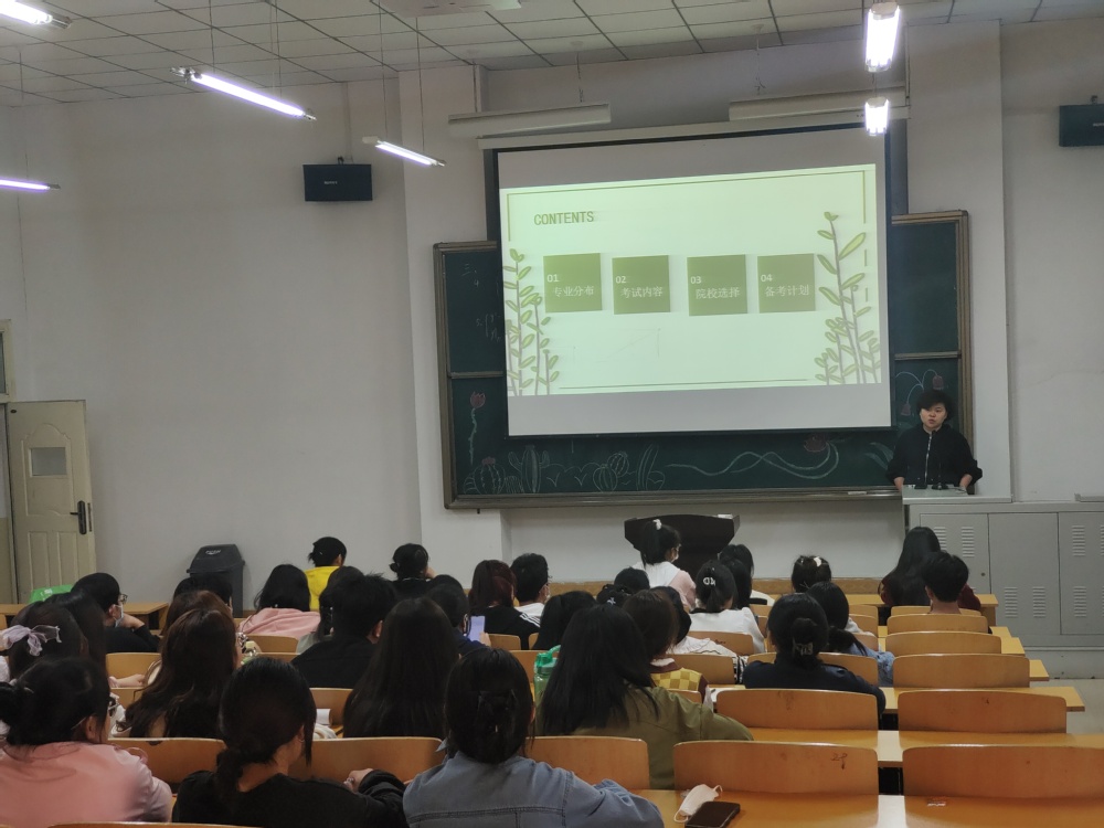会上,胡院长从专业分布、考试内容、院校选择、备考计划四个方面,用轻松幽默的语言为大家详细分析了与我院专业对应的硕士研究生专业及考试内容,院校选择的技巧;通过对比分析报考跨专业和本专业研究生的利弊,强调了报考本专业的好处,鼓励学生尽可能报考本专业;站在学生角度分析了学生报考本专业研究生的难点和堵点,并针对如何攻克“英语”和“数学”两座大山提供了思路和方法。最后,胡院长强调,一定要明确考研目标,从现在开始夯实考研英语、数学基础,踏实学习,做好科学规划。