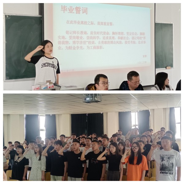 2023届毕业生徐玺玺同学率领2023届毕业生代表宣誓:在此毕业离校之际,我郑重宣誓:铭记师长教诲,肩负时代使命,胸怀理想,坚定信念、脚踏实地,爱岗敬业,崇尚科学,追求真理,奉献社会,谨记母校“厚德载物,博学济世”校训,去勇敢的博击风浪,接受考验,追求事业,为财金争光,为工商添彩。