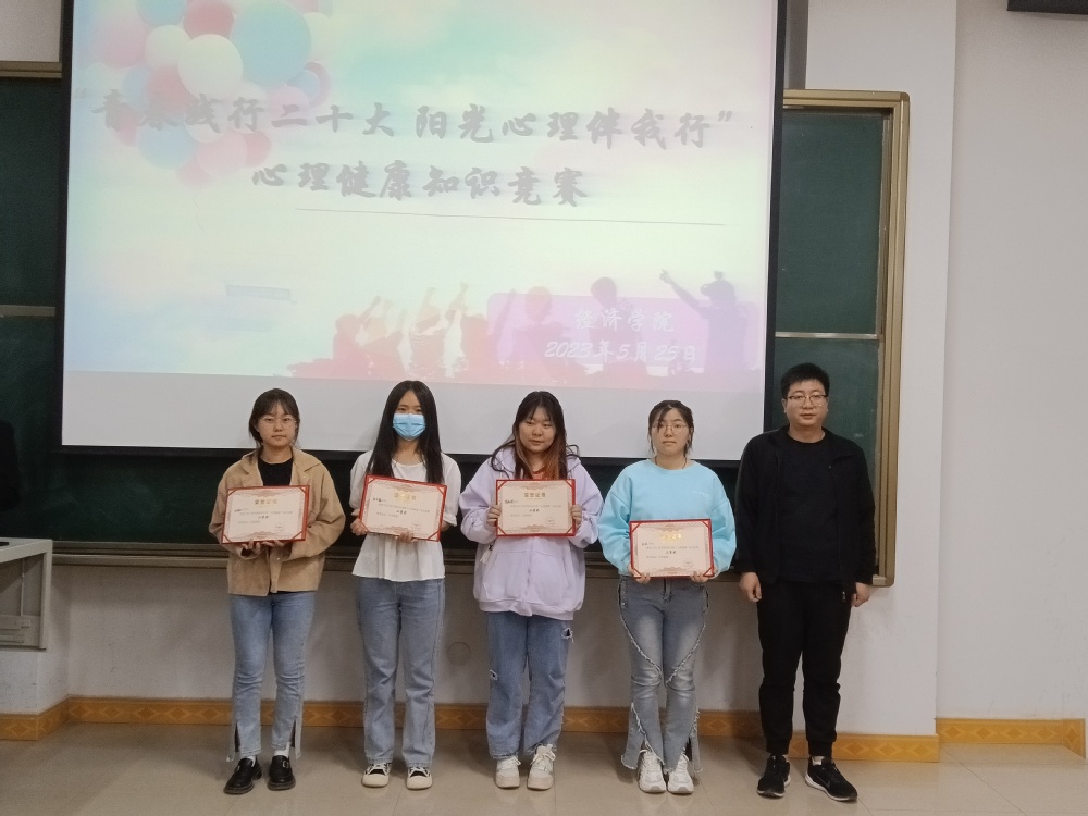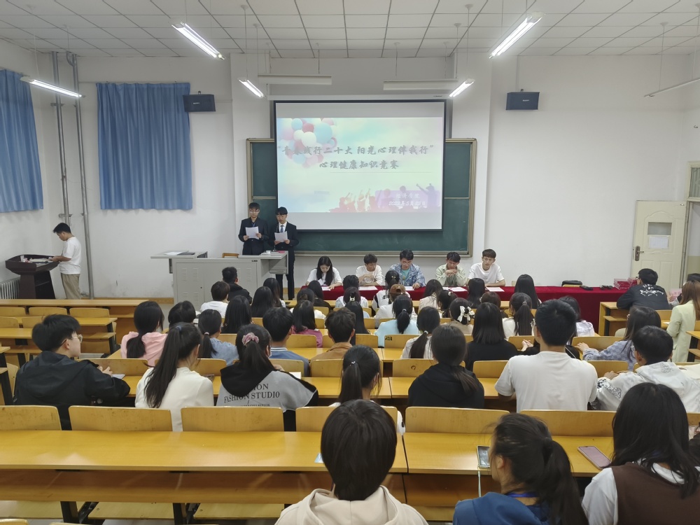 为促进我院学生学习心理健康知识的积极性,贯彻落实党的二十大提出的“重视心理健康和精神卫生”要求,激发广大同学对于关注自身心理健康的热情,在助人助己的小知识中收获心灵健康与成长。经济学院于5月25日下午在实验楼109教室开展了以“青春践行二十大,阳光心理伴我行”为主题的心理健康知识竞赛活动,经济学院党委副书记魏巍、团总支书记孙文芸以及各班学生代表参加了本次活动。