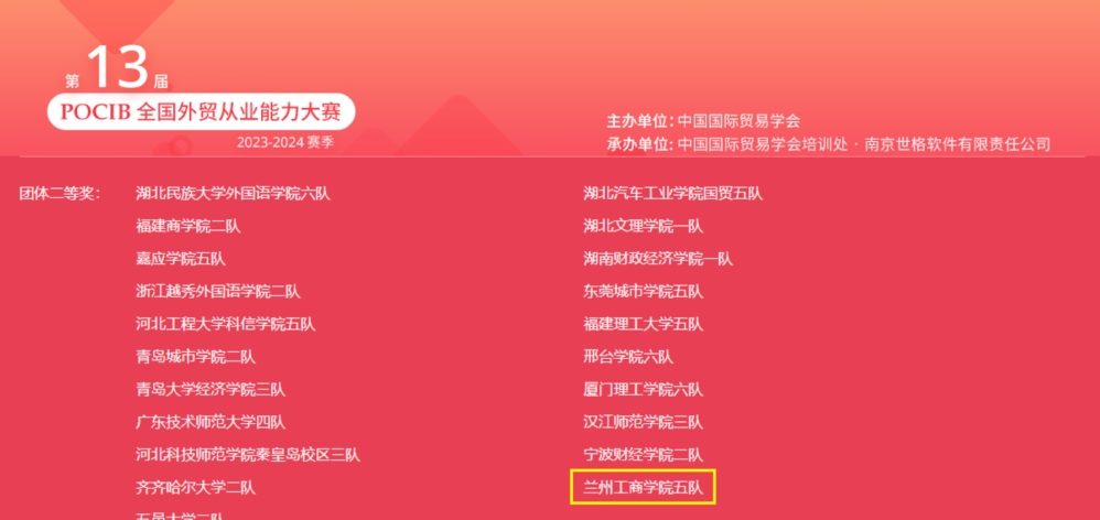 由中国国际贸易学会主办的第十三届POCIB全国外贸从业能力大赛(秋季赛)于2023年11月14日上午十点顺利结束,我院国际经济与贸易(商品质量检验与管理方向)2001、2101、2102班参赛学生,取得了团体二等奖一项,团体三等奖四项的好成绩!